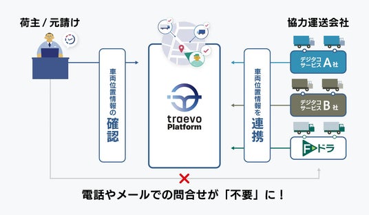 車両動態管理プラットフォーム「traevo Platform」は、トラックに搭載しているデジタルタコグラフや動態管理サービスなどから、車両の動態(車両の位置や荷役、荷待ちなどの作業ステータス)情報を車載機器メーカー、サービスを問わず一元的に集約・管理することにより、荷主・運送事業者・着荷主などステークホルダー内で情報を共有する仕組みです。