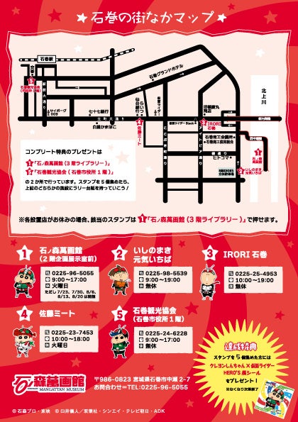 石ノ森萬画館館内と石巻の街なかのラリーポイントを巡って全5種類のスタンプを集めよう!スタンプをすべて集めた方には「クレヨンしんちゃん×仮面ライダーHERO’S展シール(非売品)」をプレゼント!ラリー用紙配布場所=石ノ森萬画館2階受付