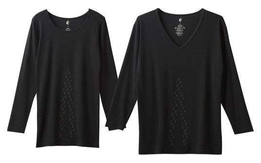 ▲販売商品(一例) あったかインナー/¥7,700(税込) レディース(左)/メンズ(右) 化繊に弱い方も安心な綿95%。心地よい肌ざわりが喜ばれています。