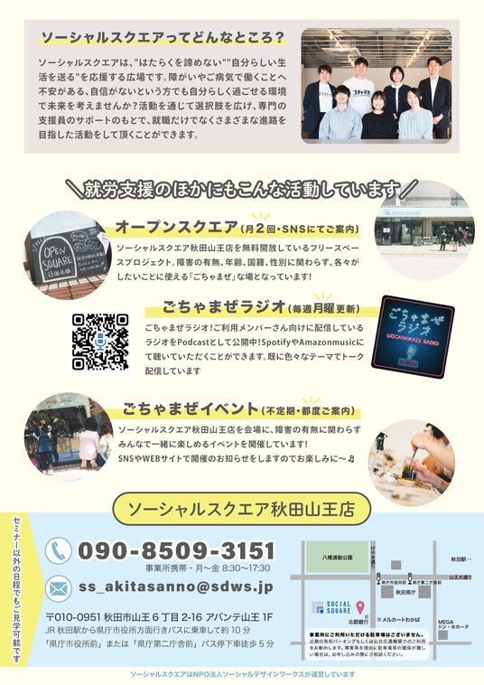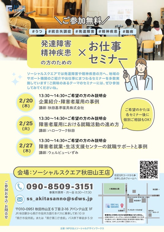 SOCIALSQUARE 秋田山王では、障害者雇用に関心のある皆さまを対象に、就職活動を支援するセミナーを開催いたします。本セミナーでは、障害者雇用に関する豊富な知識と経験を有する機関の方々や企業担当者を外部講師としてお招きし、広く役立つ情報提供と個別相談を行います。