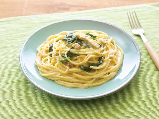 開発で“カルボナーラらしさ”をめざし着目したのは、ソースの濃厚さです。味の決め手であるチーズの配合率を増やしました。風味豊かな2種類のチーズ(ゴルゴンゾーラ、パルメザン)を増量し、卵黄も増やし、コクを深めています。これに対し、にんにくはややひかえめに調整し、黒こしょうをピリッときかせることで味全体を引き締めました。