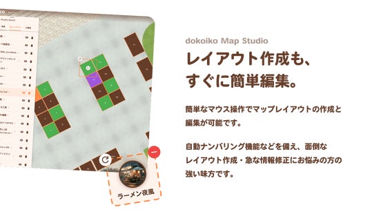 「会場マップがわかりづらい」 「詳しい出展紹介まで手が回らない」などの、イベント主催者様が抱える課題に対し、検索と詳細表示もできる”デジタルマップや、出展者が情報を更新できる”共同編集システム”などの簡単かつ美しいソリューションを提供しています。