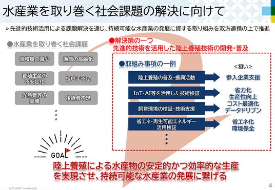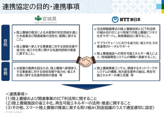 本協定は、宮城県とNTT東日本が緊密な相互連携と協働による活動を推進することにより、先進的技術を活用した陸上養殖技術の開発・普及による水産物の安定的かつ効率的な生産による持続可能な水産業の発展を図ることを目的とするものです。