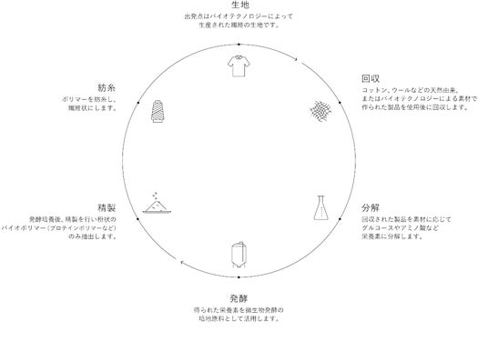 メタボリック・リサイクルとは、バイオベースの廃棄物を糖やアミノ酸などの栄養素に変換し、微生物発酵によって新たな材料を作り出すシステムのこと。このプロセスは、バイオベース廃棄物の可能性を引き出し、循環型バイオエコノミーのためのスケーラブルで実用的なソリューションとなり、得られる性能を損なうことなく低品質の廃棄物をリサイクルに利用できるようにすることで、繊維から繊維へのリサイクルに画期的なアプローチを提供します。
