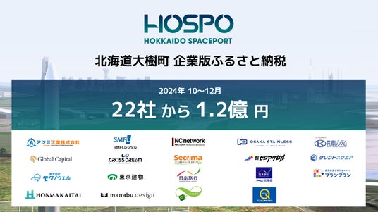 北海道大樹町(町長:黒川豊)とSPACE COTAN株式会社(本社:北海道広尾郡大樹町、代表取締役社長兼CEO:小田切義憲)は、民間にひらかれた商業宇宙港「北海道スペースポート(HOSPO)」プロジェクトの資金として、2024年10月から12月までの間に、北海道内外の22社から企業版ふるさと納税で合計1億2,090万円の寄附をいただいたことをお知らせいたします。