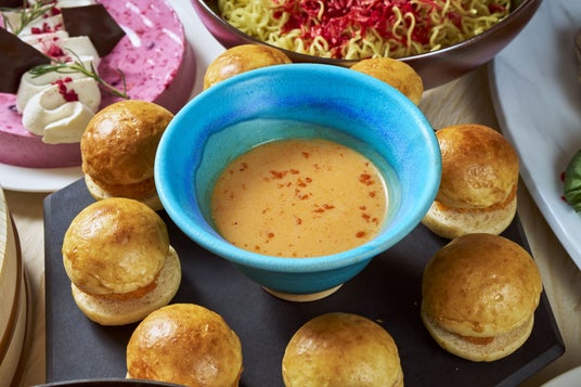 ビュッフェレストラン「スリユン」では、シグネチャーディッシュとして、炙ることで際立つ肉の香ばしさが食欲をそそる「炙り牛寿司」や、数種類のスパイスが効いた「県産豚の火鍋しゃぶしゃぶ」を常にご用意しております。