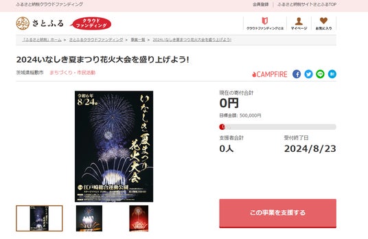 茨城県稲敷市とふるさと納税ポータルサイト「さとふる」を運営する株式会社さとふる(本社:東京都中央区、代表取締役社長 兼 CEO:藤井 宏明)は、「さとふるクラウドファンディング」にて、「2024いなしき夏まつり花火大会を盛り上げよう!」の寄付受け付けを2024年7月8日より開始します。