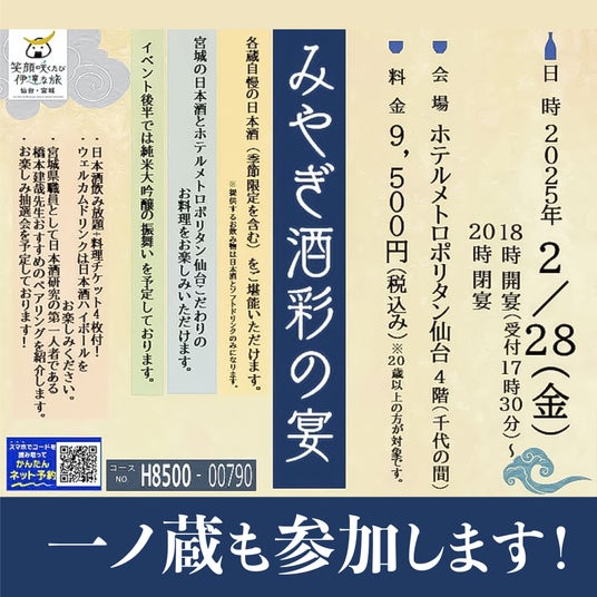 株式会社 JR 東日本びゅうツーリズム&セールス(本社所在地:東京都墨田区)は、2025年2月28日(金)に宮城県仙台市「メトロポリタン仙台」にて『みやぎ酒彩の宴』を開催し、株式会社 一ノ蔵も本イベントに参加いたします。