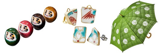 左:津軽塗(青森県)「ダルマ」 / 中央:九谷焼(石川県) 「九谷陶片アクセサリー」 / 右:有松・鳴海絞(愛知県) 「有松・鳴海絞 日傘」