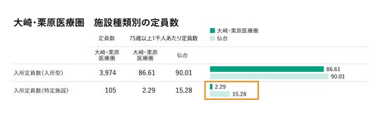 この変化に伴い、医療や介護の需要の高まりとともに、医療ケアを提供する場所や人材などの不足が見込まれます。現在、大崎市を含む大崎・栗原医療圏において、特定施設といわれる介護保険適用の高齢者向け住居施設の定員数は非常に少なく、75歳人口1千人に対して2.29人と、仙台のわずか7分の1程度に留まります。(※2)