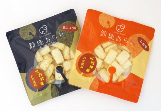 このたび新商品としてあられが完成いたしました。原材料は福島県川内村と飯舘村のもち米を使用。黒こしょう味としお味の2種類で容量20gと食べ切りサイズです。地元の特産品として、お土産やおやつ、お酒のおつまみにもぴったりです。もち米の風味を損なわないよう薄味に仕上げました。