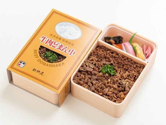 ●【新杵屋】 牛肉どまん中 (山形県)山形県産米「どまんなか」をふっくら炊き上げ、その上に特製のタレで味付けした牛そぼろと牛肉煮をのせた牛丼風のお弁当です。