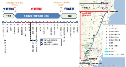 今回、特定自動運行を実施するBRT専用道区間には、バス停が14箇所、一般道との交差部が11箇所、横断指導線(歩行者等の横断部)が15箇所(バス停に9箇所、走行路線上に6箇所)含まれています(図2、図3)。また、車道と歩道の間にガードレール等がある場所や縁石のみで仕切られている場所が混在するうえ、手動運転バス車両とのすれ違いなど、さまざまな走行環境が含まれます。