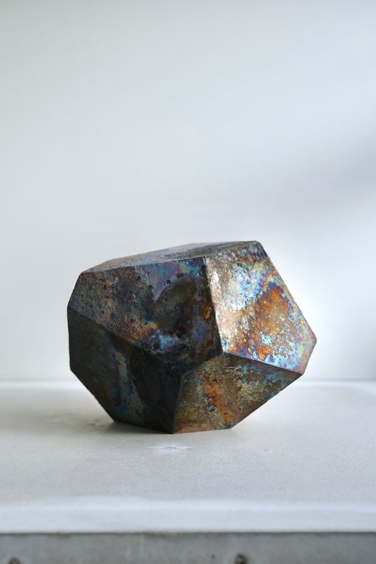 独特な金属質のテクスチャーを持った重厚感のある陶芸作品を制作し、これまで国内外で数々の展覧会で発表している橋本知成氏。球体を含めた巨大な作品もふくめて、すべて手捻りで土を積み上げて成形し、最終的に金属質の高い釉薬を施したのち、レンガを積み上げた巨大な窯でゆっくりと焼き上げています。美しい金属質の表面は光の当たる具合や長い時間の経過のなかで表情を変えていきます。2019年のロエベクラフトプライズファイナリストでもあり、ヴィクトリア&アルバート博物館、ロサンゼルス・カウンティ美術館、ヒューストン美術館、兵庫陶芸美術館などに作品が収蔵されています。