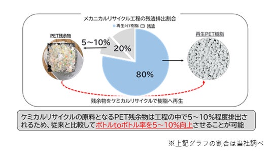 メカニカルリサイクルではリサイクルの工程で約20%の残渣が発生しますが、そのうち5~10%の残余物はペットボトル以外のものへのリサイクルが主となっています。残余物の一部にはペットボトル素材が含まれているため、残余物もペットボトル原料に再生することで、効率的かつ持続的なリサイクルが実現できます。