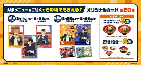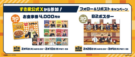 すき家公式Xにて、抽選でオリジナルグッズが当たるキャンペーンを実施します。第1弾では、「ハイキュー!!」オリジナルデザインのすき家でご利用いただけるお食事券、第2弾では、描き下ろしイラストを使用したB2ポスターが当たります。
