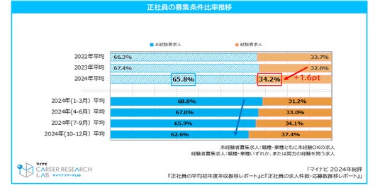 株式会社マイナビ(本社:東京都千代田区、代表取締役 社長執行役員:土屋芳明)が運営する総合転職情報サイト『マイナビ転職』(https://tenshoku.mynavi.jp/)は、「正社員の平均初年度年収推移レポート」と「正社員求人件数・応募数推移レポート」について、2024年の総評を発表しました。本調査は、総合転職情報サイト『マイナビ転職』に掲載された求人の「平均初年度年収(未経験・経験者求人別)」、「求人件数・応募数」の推移を調査したものです。