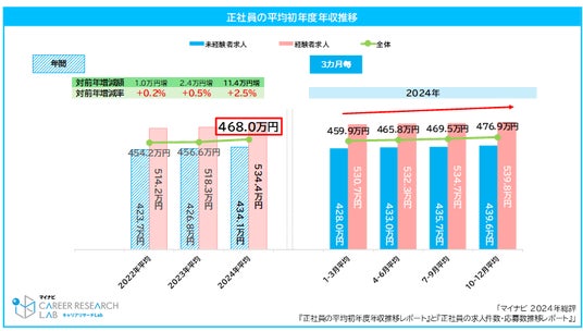 2024年の正社員の平均初年度年収は468.0万円で前年から11.4万円増加