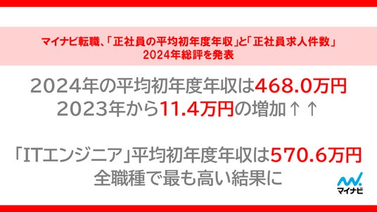 2024年の平均初年度年収は468.0万円で前年から11.4万円増加。求人件数は2019年比174.6%で4年連続の増加。平均初年度年収が最も高い職種は「ITエンジニア」で570.6万円
