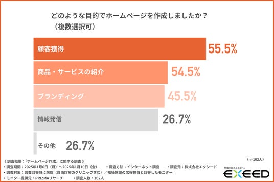 「どのような目的でホームページを作成しましたか?(複数選択可)」と質問したところ、『顧客獲得(52.9%)』と回答した方が最も多く、次いで『商品・サービスの紹介(41.2%)』『ブランディング(40.2%)』となりました。