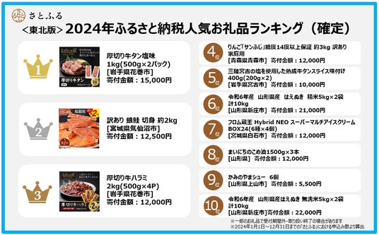 ふるさと納税ポータルサイト「さとふる」を運営する株式会社さとふる(本社:東京都中央区、代表取締役社長 兼 CEO:藤井 宏明)は、「さとふる」における<東北版>2024年ふるさと納税人気お礼品ランキング(確定)(※1)を発表します。