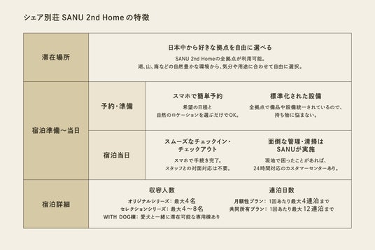 「SANU 2nd Home」は、都市での仕事や暮らしを続けながら、日本中の美しい自然の中での滞在をシームレス楽しめるメンバーシップ制のセカンドホームサービスです。週末のお出かけ先としてのレジャー利用から、夏休みや冬休みと行った長期休暇の利用まで、日本中の自然から行き先を自由に選んで滞在することができます。