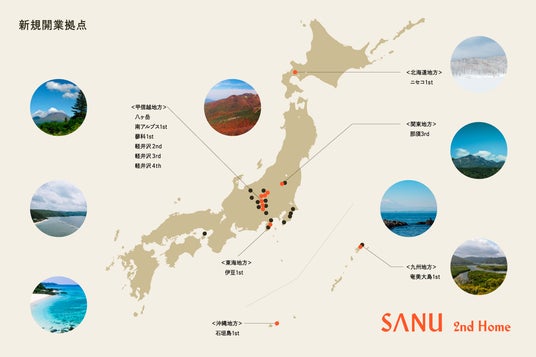 シェア別荘サービス「SANU 2nd Home」を運営する株式会社Sanu(本社:東京都目黒区、代表取締役:福島 弦)は、新たに石垣島、ニセコ、奄美大島を含む全国12拠点の新規開業を発表します。これにより、全国40拠点を運営する日本最大級のサービスへと拡大し、2028年までには100拠点以上の展開を目指します。日本中の美しい自然の中に「もう一つの家」を広く展開することによって、都市と自然を行き来する新しいライフスタイルを提案します。