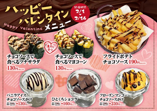 回転寿司のパイオニア「平禄寿司」では、2月1日(土)~ 14日(金)まで限定店舗※にてチョコレートを使用した「バレンタイン」メニューを販売いたします。「チョコソースで食べるツナサラダ」や「チョコソースで食べるマヨコーン」など、和食の代表格「お寿司」と洋菓子の代表格「チョコレート」の「1年に1度の恋の物語」をお楽しみいただければと思います。また、「ひとくちショコラ」などのスイーツもご用意させていただきます。どうぞ、この機会にご利用ください。皆さまのご来店をお待ちしております。※関東地方の店舗では販売をいたしません