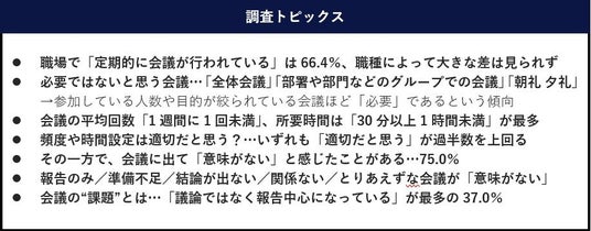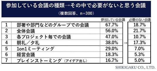 必要ではないと思う会議…「全体会議」「部署や部門での会議」が上位/会議に出て「意味がない」と感じたことがある…75.0%