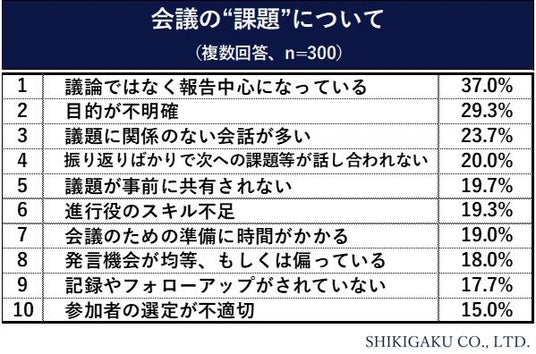 最も多かったのは「議論ではなく報告中心になっている」の37.0%で、「目的が不明確」が29.3%、「議題に関係のない会話が多い」23.7%、「振り返りばかりで次への課題等が話し合われない」20.0%と続きました。