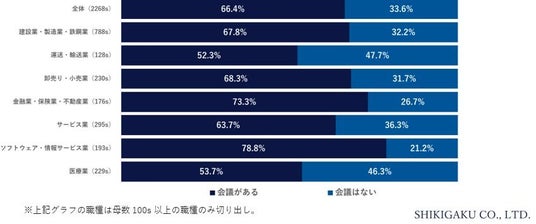 20代~50代の会社員(※会社規模10人以上)の方に会議の内容は問わず、クライアントやパートナーと行うものではない「職場の“会議”」の有無について聞いてみると、会議が「ある」と回答したのは66.4%という結果でした。職種別でも、会議の有無に大きな差はみられませんでした。