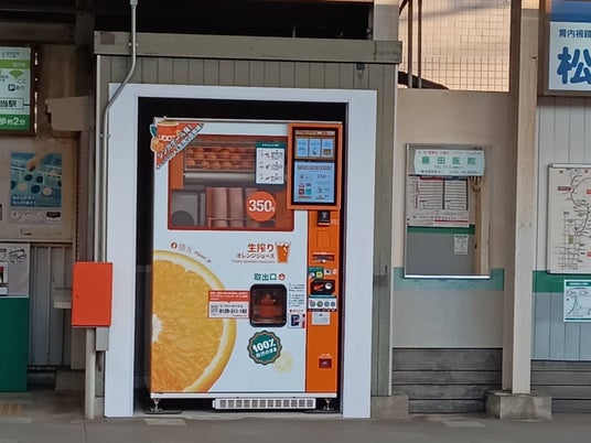 修学院駅で稼働中の生搾りオレンジジュース自販機IJOOZ
