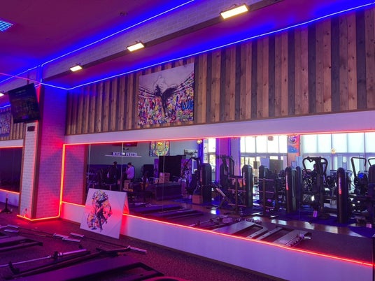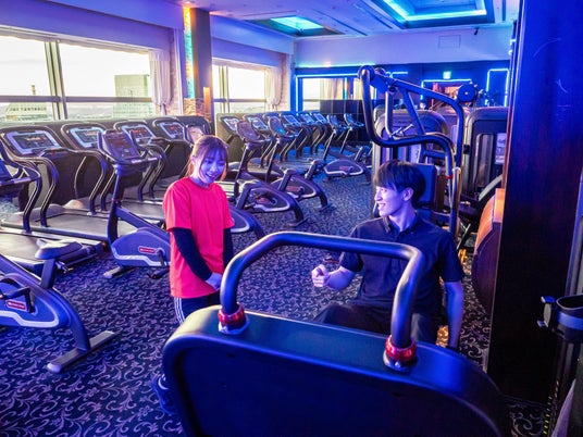 店内は “ディスコのようなライティング” と、“宇宙のような没入感” を演出する ブルー×レッドの独自照明 で彩られ、従来のジムにはない エンタメ感覚の空間 。