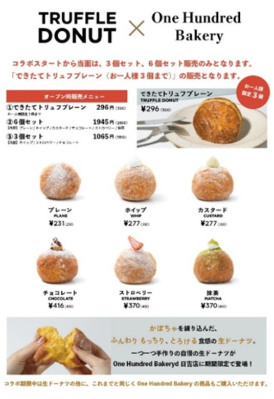 池袋や日吉をはじめとする関東エリアの他、愛知県や静岡県、福島県などにも展開しており、その中で今回は「One Hundred Bakery日吉店」で「TRUFFLE DONUT」とコラボ開催となります。