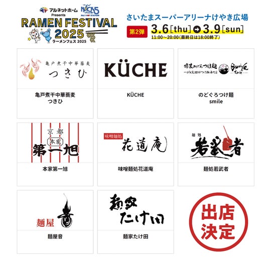 2月28日(金)から始まるイベント『アルネットホームpresents NACK5 ラーメンフェスティバル2025』(https://nack5-ramenfes.com/)の参加ラーメン店が決定いたしました!