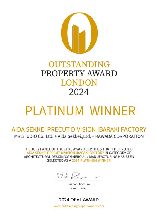 この度、株式会社アイダ設計(本社:埼玉県上尾市、代表取締役社長:會田 貞光)が運営する「プレカット事業部 茨城工場」は、ロンドンの国際的なデザイン賞「OPAL Awards 2024(OUTSTANDING PROPERTY AWARD LONDON)」の建築デザイン部門においてプラチナ賞を受賞しました。今回の受賞で、国内外のデザインアワード通算30冠を達成しました。