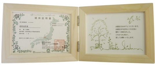 里親(樹を贈られた人)には、確かに樹が植えられた証である「植樹証明書」が届きます。樹には1本1本に管理番号が振られ、森林組合などの林業のプロにより森になるまで大切に保育管理されます。この証明書が手元にあることによって、自身が里親になった樹のある森との縁が可視化されます。