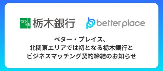 本ビジネスマッチング契約は、栃木県に本店を置き、豊かな地域社会づくりに貢献する取り組みを行う栃木銀行が、人材の定着に悩む法人顧客に、ベター・プレイスが導入推進する企業年金・退職金制度「はぐくみ企業年金」を案内し、導入企業を拡大することを目的としています。