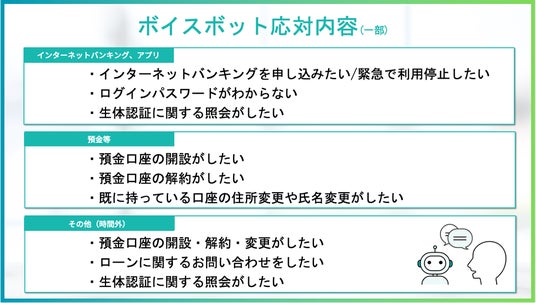 今回の七十七銀行では、「AI Messenger Voicebot」を下記領域の電話応対にご活用いただいております。