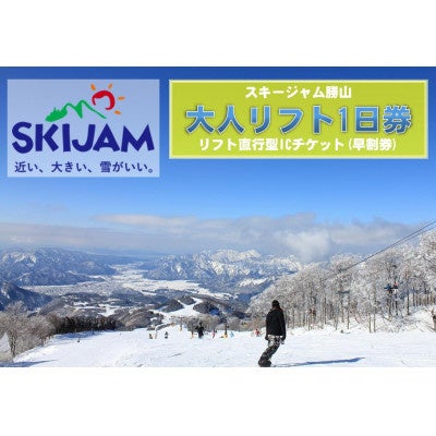 期間限定で寄付申込みを受け付けていた、西日本屈指のスキー場「スキージャム勝山」で2024-2025シーズンに使用できる大人リフト1日券です。リフト乗り場直行型のICチケットになっているため、チケット売り場に並ばずそのままゲレンデに行くことができます。