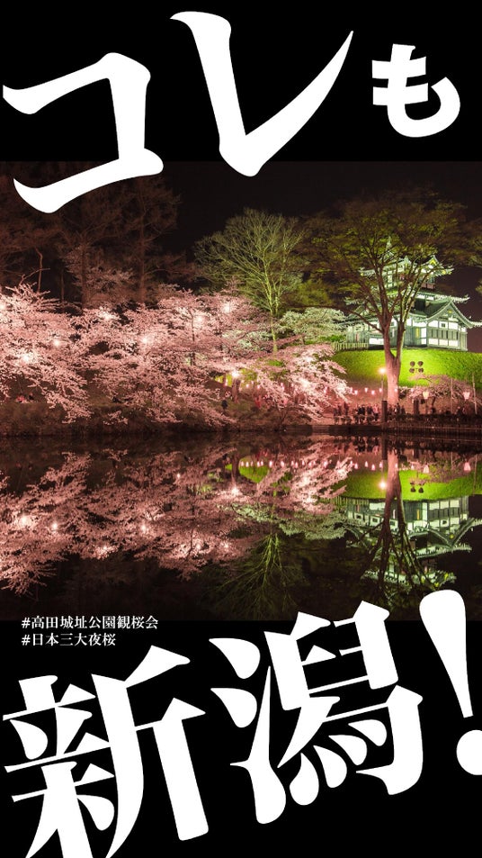 2月3日~16日のPRエリアは上越市です。今年第100回の開催となる高田城址公園観桜会をご紹介。公園とその周辺には約4,000本の桜が咲き誇り、高田城三重櫓とともにぼんぼりの灯りに照らしだされ、お堀の水面に映るさまは、日本三大夜桜の1つに数えられています。その美しさを首都圏の大画面でご紹介します。