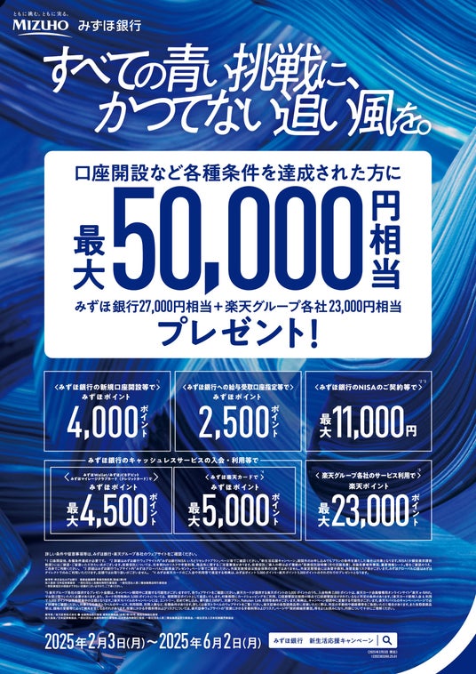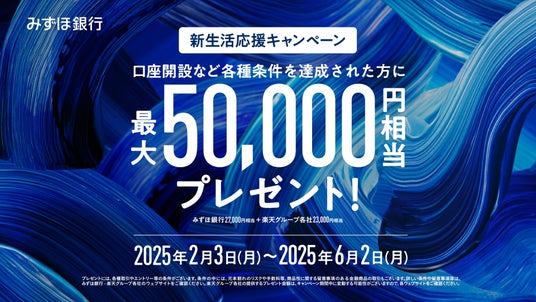 「すべての青い挑戦に、かつてない追い風を。」をテーマに、みずほ銀行史上最大級となる、最大50,000円相当が貰える「新生活応援キャンペーン」を開催します。2月3日(月)から6月2日(月)までの期間、みずほ銀行で新規口座開設やみずほ銀行の商品やサービスの利用等、各種条件を達成された方には最大27,000円相当(みずほ銀行で口座をお持ちの方は最大23,000円相当)、さらに楽天グループ各社の対象サービス利用等で最大で23,000円相当をプレゼントします。