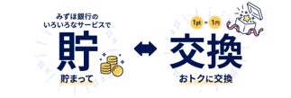2025年4月中旬(予定)より、みずほマイレージクラブがレベルアップし、ATM時間外手数料無料等の「うれしい特典」に加えて新たにスタートするサービスです。みずほ銀行のお取引で、「みずほポイント」が貯まり、貯めたポイントを他社ポイント等と交換できます。詳細は「みずほポイントモール」ページを参照ください。