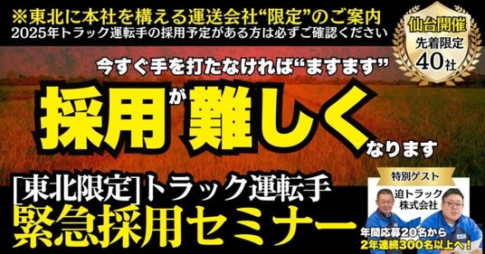 日本最大級の物流コンサルティングファーム 船井総研ロジ株式会社(本社:大阪市中央区、代表:橋本直行、以下「船井総研ロジ」)は、2025年3月12日(水)14:00~17:00、 東北に本社を置く運送会社の経営者・経営幹部を対象にした「【東北限定】トラック運転手緊急採用セミナー」を開催いたします。