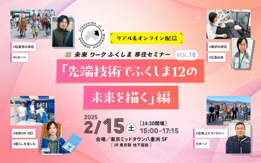 福島12市町村で実際に活躍する多様なゲストを毎回テーマごとにお呼びし、移住を決めたきっかけやその経緯、移住後のリアルな実体験を聞く、未来ワークふくしま移住セミナー。第18回となる今回は「先端技術でふくしま12の未来を描く」をテーマに、2月15日(土)に東京で開催します。