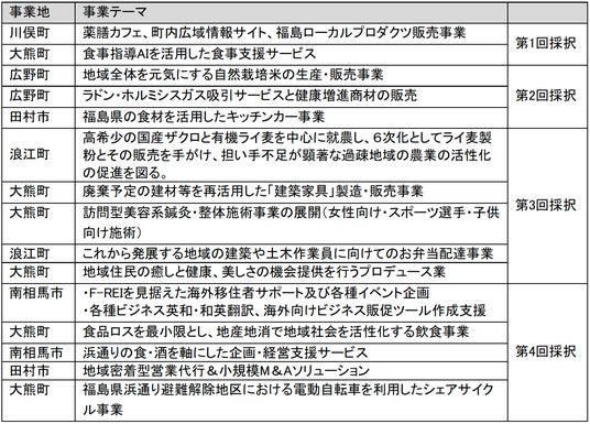 採択された事業の事業地とテーマは以下の通りです(福島県発表資料より)。