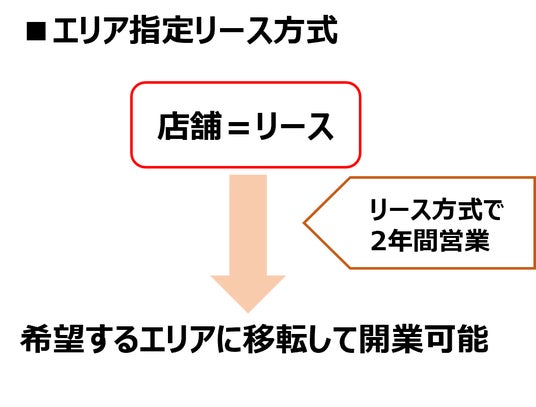 当社では、低資金で開業できる仕組みとして、「リース方式」、「エリア指定リース方式」を用意しています。ともに本部が用意した店舗を店主に貸し出すことにより初期投資を抑えて開業できます。「リース方式」は本部から貸し出された店舗で営業を続け、「エリア指定リース方式」は当初貸し出された店舗で2年間営業した後には希望するエリアに移転して営業ができます。