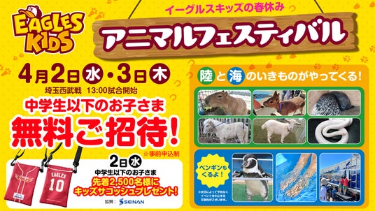 株式会社楽天野球団(本社:宮城県仙台市宮城野区、代表取締役社長:森井 誠之)は、イーグルスキッズが楽しめるイベントとして、4月2日(水)、3日(木)『イーグルスキッズの春休み~アニマルフェスティバル~』を開催することとなりましたので、お知らせいたします。