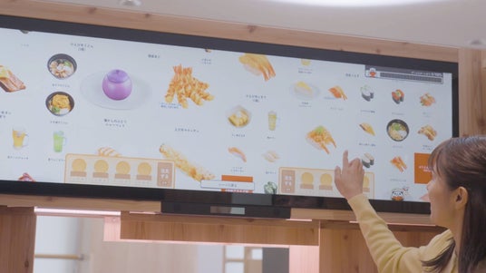 様々な商品を見ながら新たなおすしに巡り合える楽しさ、選べる楽しさを味わえる回転すしの醍醐味を、画面上で再現した大型タッチディスプレイです。流れるおすしを映像で見ながら、画面を指で操作し商品を注文することができるほか、みんなで画面を見ることができ、同時に操作も可能です。