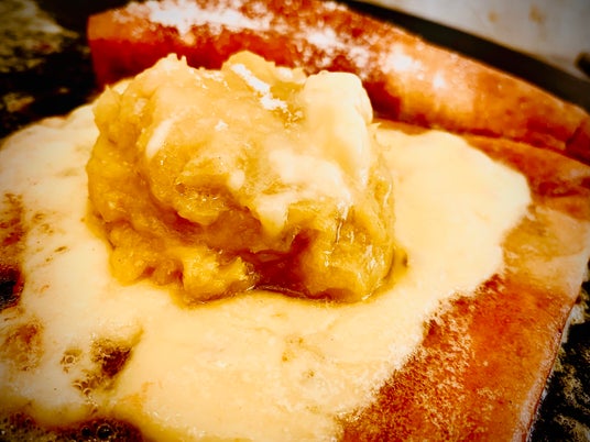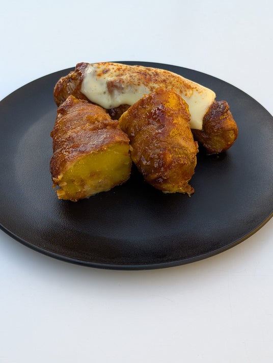 紅あずまのホクホク食感に焼き目をつけたお肉を巻き濃い目のソースで味付けしました。さらに上には香ばしく炙ったチーズをのせ今までにない新しい紅あずまの食事系スイーツです。